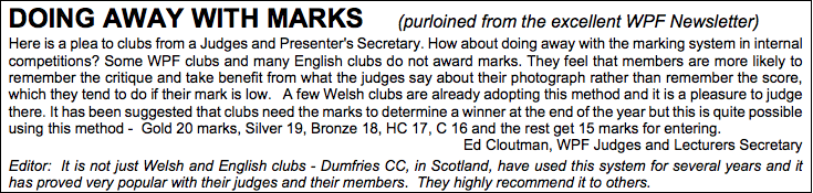 Mike Farley wrote:I have seen this done elsewhere, with certificates for 1st, 2nd, 3rd and three hon mentions. The club has four competitions per season for each of prints and DPIs, but there is no overall ranking at the end of the season and no trophies are awarded.